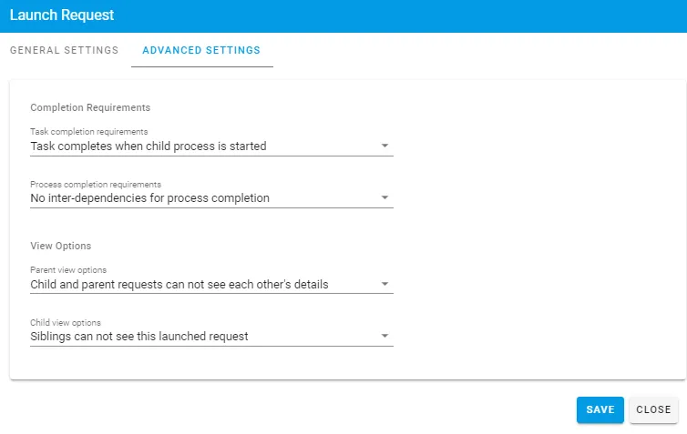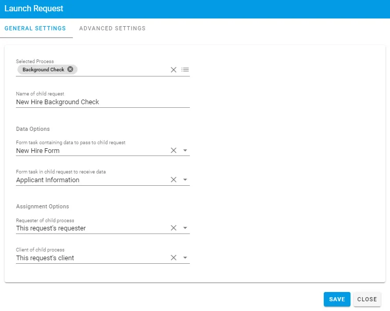 Once you have made your selections for the General Settings tab, select the Advanced Settings tab from within the Launch Request task configuration. This will give you the following options: