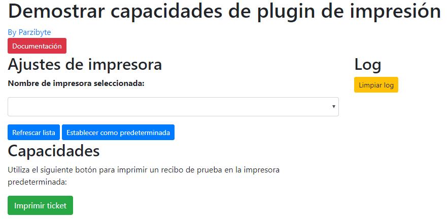 <!doctype html> <html lang="es"> <!-- Plantilla inicial de Bootstrap 4 @author parzibyte Visita: https://parzibyte.me/blog/ --> <head> <meta charset="utf-8"> <meta name="viewport" content="width=device-width, initial-scale=1, shrink-to-fit=no"> <meta name="description" content="Demostrar capacidades de plugin de impresión para impresora térmica en JavaScript"> <meta name="author" content="Parzibyte"> <title>Demostrar capacidades de plugin de impresión</title> <!-- Cargar el CSS de Boostrap--> <link href="https://stackpath.bootstrapcdn.com/bootstrap/4.3.1/css/bootstrap.min.css" rel="stylesheet" integrity="sha384-ggOyR0iXCbMQv3Xipma34MD+dH/1fQ784/j6cY/iJTQUOhcWr7x9JvoRxT2MZw1T" crossorigin="anonymous"> </head> <body> <main role="main" class="container-fluid"> <div class="row"> <div class="col-12"> <h1>Demostrar capacidades de plugin de impresión</h1> <a href="https://parzibyte.me/blog/">By Parzibyte</a> <br> <a class="btn btn-danger btn-sm" href="../../index.html">Documentación</a> </div> <!-- Aquí pon las col-x necesarias, comienza tu contenido, etcétera --> <div class="col-12 col-lg-6"> <h2>Ajustes de impresora</h2> <strong>Nombre de impresora seleccionada: </strong> <p id="impresoraSeleccionada"></p> <div class="form-group"> <select class="form-control" id="listaDeImpresoras"></select> </div> <button class="btn btn-primary btn-sm" id="btnRefrescarLista">Refrescar lista</button> <button class="btn btn-primary btn-sm" id="btnEstablecerImpresora">Establecer como predeterminada</button> <h2>Capacidades</h2> <p>Utiliza el siguiente botón para imprimir un recibo de prueba en la impresora predeterminada:</p> <button class="btn btn-success" id="btnImprimir">Imprimir ticket</button> </div> <div class="col-12 col-lg-6"> <h2>Log</h2> <button class="btn btn-warning btn-sm" id="btnLimpiarLog">Limpiar log</button> <pre id="estado"></pre> </div> </div> </main> <script src="./script.js"></script> </body> </html> Tenemos varios elementos. Originalmente la página se ve así: