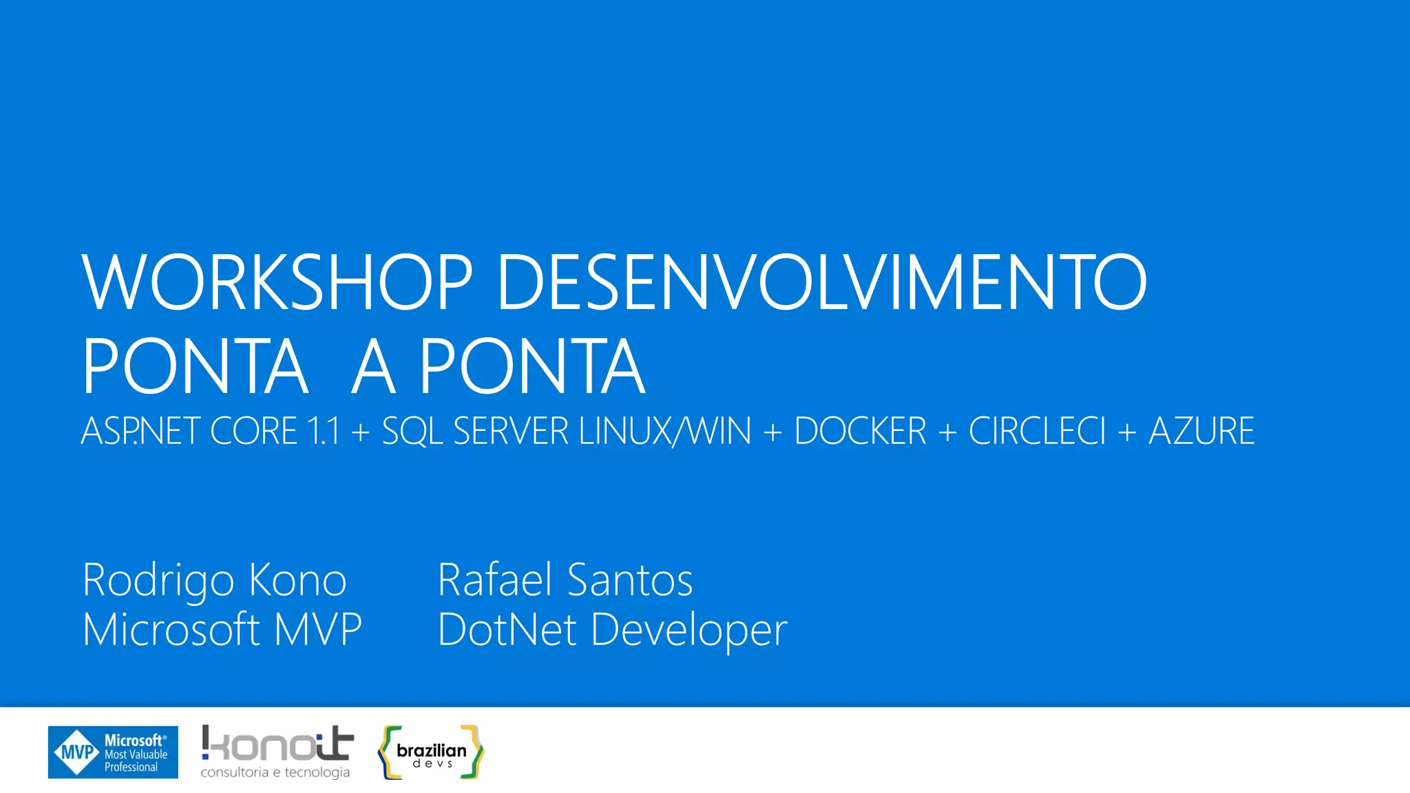Este documento apresenta informações sobre dois desenvolvedores - Rodrigo Kono e Rafael dos Santos - incluindo suas experiências, especialidades e contatos. Também descreve um evento online gratuito de 5 noites sobre desenvolvimento ASP.NET Core 1.1 com testes, integração contínua e deploy na nuvem Azure.