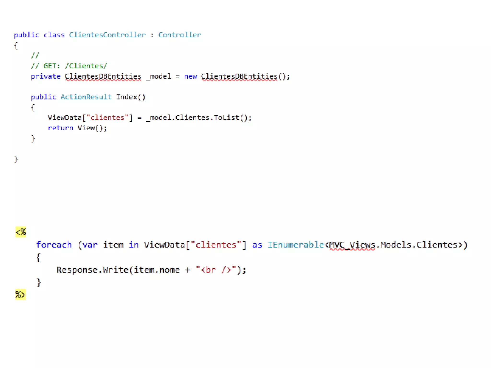ViewData • ViewData éum dicionário que possui como chave somente strings. Você pode passar para a ViewData qualquer tipo de objeto. • Um controller passa informações para as views usando ViewData. • O código abaixo mostra um exemplo de como um controlador pode passar uma lista de clientes para uma view através deste dicionário:
