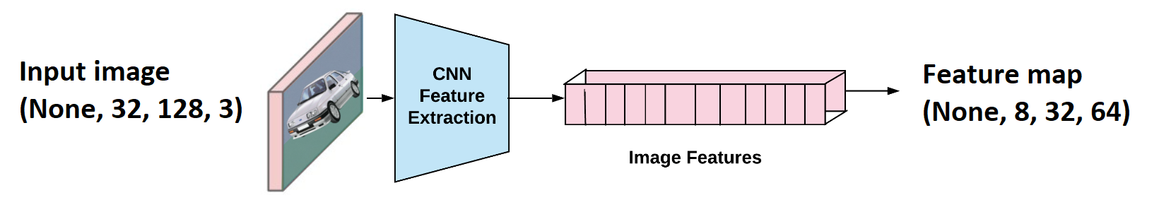 The above image shows that an image (32x128 size) is sent through convolutional layers. Layers are designed so that, as a result, we obtain feature maps of the shape (None, 8, 32, 64). "None" here is the batch size that could take any value.