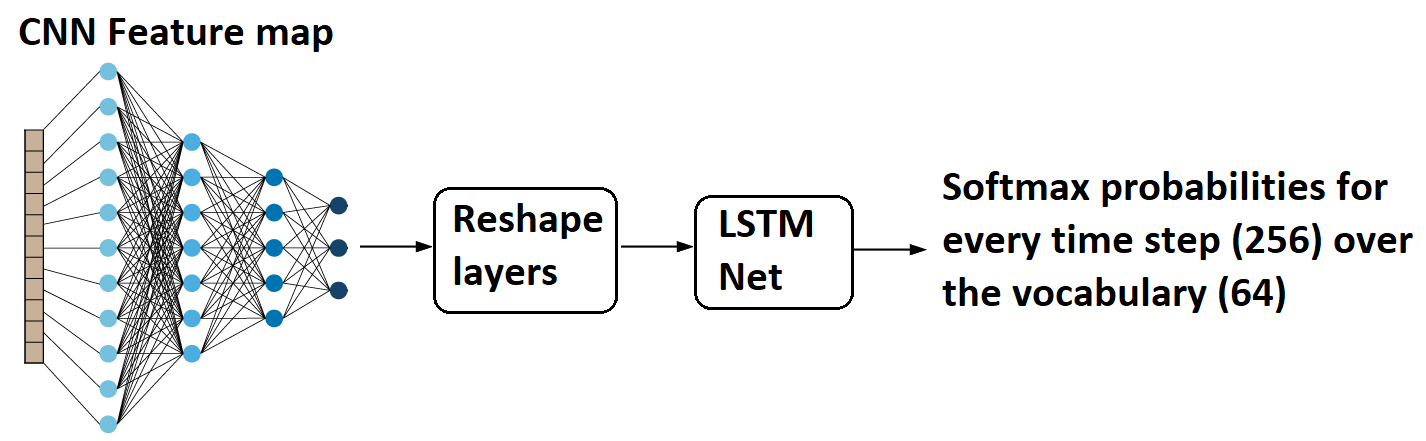 Layer (type) Output Shape Param # Connected to ====================================================================================================================================================== input (InputLayer) [(None, 32, 128, 3)] 0 [] lambda (Lambda) (None, 32, 128, 3) 0 ['input[0][0]'] conv2d (Conv2D) (None, 32, 128, 16) 448 ['lambda[0][0]'] batch_normalization (BatchNormalization) (None, 32, 128, 16) 64 ['conv2d[0][0]'] leaky_re_lu (LeakyReLU) (None, 32, 128, 16) 0 ['batch_normalization[0][0]'] conv2d_1 (Conv2D) (None, 32, 128, 16) 2320 ['leaky_re_lu[0][0]'] batch_normalization_1 (BatchNormalization) (None, 32, 128, 16) 64 ['conv2d_1[0][0]'] conv2d_2 (Conv2D) (None, 32, 128, 16) 64 ['lambda[0][0]'] add (Add) (None, 32, 128, 16) 0 ['batch_normalization_1[0][0]', 'conv2d_2[0][0]'] leaky_re_lu_1 (LeakyReLU) (None, 32, 128, 16) 0 ['add[0][0]'] dropout (Dropout) (None, 32, 128, 16) 0 ['leaky_re_lu_1[0][0]'] conv2d_3 (Conv2D) (None, 16, 64, 16) 2320 ['dropout[0][0]'] batch_normalization_2 (BatchNormalization) (None, 16, 64, 16) 64 ['conv2d_3[0][0]'] leaky_re_lu_2 (LeakyReLU) (None, 16, 64, 16) 0 ['batch_normalization_2[0][0]'] conv2d_4 (Conv2D) (None, 16, 64, 16) 2320 ['leaky_re_lu_2[0][0]'] batch_normalization_3 (BatchNormalization) (None, 16, 64, 16) 64 ['conv2d_4[0][0]'] conv2d_5 (Conv2D) (None, 16, 64, 16) 272 ['dropout[0][0]'] add_1 (Add) (None, 16, 64, 16) 0 ['batch_normalization_3[0][0]', 'conv2d_5[0][0]'] leaky_re_lu_3 (LeakyReLU) (None, 16, 64, 16) 0 ['add_1[0][0]'] dropout_1 (Dropout) (None, 16, 64, 16) 0 ['leaky_re_lu_3[0][0]'] conv2d_6 (Conv2D) (None, 16, 64, 16) 2320 ['dropout_1[0][0]'] batch_normalization_4 (BatchNormalization) (None, 16, 64, 16) 64 ['conv2d_6[0][0]'] leaky_re_lu_4 (LeakyReLU) (None, 16, 64, 16) 0 ['batch_normalization_4[0][0]'] conv2d_7 (Conv2D) (None, 16, 64, 16) 2320 ['leaky_re_lu_4[0][0]'] batch_normalization_5 (BatchNormalization) (None, 16, 64, 16) 64 ['conv2d_7[0][0]'] add_2 (Add) (None, 16, 64, 16) 0 ['batch_normalization_5[0][0]', 'dropout_1[0][0]'] leaky_re_lu_5 (LeakyReLU) (None, 16, 64, 16) 0 ['add_2[0][0]'] dropout_2 (Dropout) (None, 16, 64, 16) 0 ['leaky_re_lu_5[0][0]'] conv2d_8 (Conv2D) (None, 8, 32, 32) 4640 ['dropout_2[0][0]'] batch_normalization_6 (BatchNormalization) (None, 8, 32, 32) 128 ['conv2d_8[0][0]'] leaky_re_lu_6 (LeakyReLU) (None, 8, 32, 32) 0 ['batch_normalization_6[0][0]'] conv2d_9 (Conv2D) (None, 8, 32, 32) 9248 ['leaky_re_lu_6[0][0]'] batch_normalization_7 (BatchNormalization) (None, 8, 32, 32) 128 ['conv2d_9[0][0]'] conv2d_10 (Conv2D) (None, 8, 32, 32) 544 ['dropout_2[0][0]'] add_3 (Add) (None, 8, 32, 32) 0 ['batch_normalization_7[0][0]', 'conv2d_10[0][0]'] leaky_re_lu_7 (LeakyReLU) (None, 8, 32, 32) 0 ['add_3[0][0]'] dropout_3 (Dropout) (None, 8, 32, 32) 0 ['leaky_re_lu_7[0][0]'] conv2d_11 (Conv2D) (None, 8, 32, 32) 9248 ['dropout_3[0][0]'] batch_normalization_8 (BatchNormalization) (None, 8, 32, 32) 128 ['conv2d_11[0][0]'] leaky_re_lu_8 (LeakyReLU) (None, 8, 32, 32) 0 ['batch_normalization_8[0][0]'] conv2d_12 (Conv2D) (None, 8, 32, 32) 9248 ['leaky_re_lu_8[0][0]'] batch_normalization_9 (BatchNormalization) (None, 8, 32, 32) 128 ['conv2d_12[0][0]'] add_4 (Add) (None, 8, 32, 32) 0 ['batch_normalization_9[0][0]', 'dropout_3[0][0]'] leaky_re_lu_9 (LeakyReLU) (None, 8, 32, 32) 0 ['add_4[0][0]'] dropout_4 (Dropout) (None, 8, 32, 32) 0 ['leaky_re_lu_9[0][0]'] conv2d_13 (Conv2D) (None, 8, 32, 64) 18496 ['dropout_4[0][0]'] batch_normalization_10 (BatchNormalization) (None, 8, 32, 64) 256 ['conv2d_13[0][0]'] leaky_re_lu_10 (LeakyReLU) (None, 8, 32, 64) 0 ['batch_normalization_10[0][0]'] conv2d_14 (Conv2D) (None, 8, 32, 64) 36928 ['leaky_re_lu_10[0][0]'] batch_normalization_11 (BatchNormalization) (None, 8, 32, 64) 256 ['conv2d_14[0][0]'] conv2d_15 (Conv2D) (None, 8, 32, 64) 2112 ['dropout_4[0][0]'] add_5 (Add) (None, 8, 32, 64) 0 ['batch_normalization_11[0][0]', 'conv2d_15[0][0]'] leaky_re_lu_11 (LeakyReLU) (None, 8, 32, 64) 0 ['add_5[0][0]'] dropout_5 (Dropout) (None, 8, 32, 64) 0 ['leaky_re_lu_11[0][0]'] conv2d_16 (Conv2D) (None, 8, 32, 64) 36928 ['dropout_5[0][0]'] batch_normalization_12 (BatchNormalization) (None, 8, 32, 64) 256 ['conv2d_16[0][0]'] leaky_re_lu_12 (LeakyReLU) (None, 8, 32, 64) 0 ['batch_normalization_12[0][0]'] conv2d_17 (Conv2D) (None, 8, 32, 64) 36928 ['leaky_re_lu_12[0][0]'] batch_normalization_13 (BatchNormalization) (None, 8, 32, 64) 256 ['conv2d_17[0][0]'] add_6 (Add) (None, 8, 32, 64) 0 ['batch_normalization_13[0][0]', 'dropout_5[0][0]'] leaky_re_lu_13 (LeakyReLU) (None, 8, 32, 64) 0 ['add_6[0][0]'] dropout_6 (Dropout) (None, 8, 32, 64) 0 ['leaky_re_lu_13[0][0]'] reshape (Reshape) (None, 256, 64) 0 ['dropout_6[0][0]'] bidirectional (Bidirectional) (None, 256, 128) 66048 ['reshape[0][0]'] output (Dense) (None, 256, 63) 8127 ['bidirectional[0][0]'] ====================================================================================================================================================== Total params: 252,799 Trainable params: 251,839 Non-trainable params: 960 ______________________________________________________________________________________________________________________________________________________ This may give you limited information if you are unfamiliar with TensorFlow, but the idea here is to create a model with the correct output for our CTC loss function. To do so, we must transition from CNN to LSTM layers. To do so, I used a reshaped CNN last layer to remove one dimension, which would be great for LSTM input.