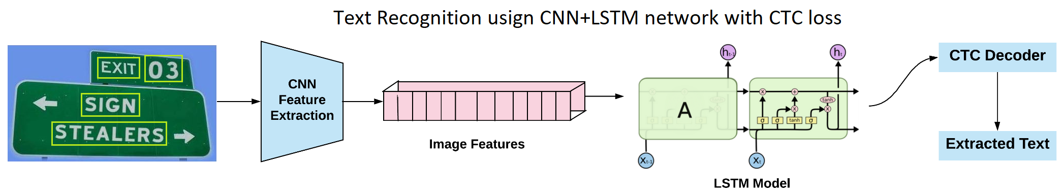 After the text localization step, regions containing text are cropped and sent through CNN layers to extract image features. These features are later fed into a many-to-many LSTM architecture that outputs softmax probabilities via a dictionary. These outputs at different time steps are provided to the CTC decoder to obtain the raw text from the images. I will cover each step in detail in the following sections of the tutorial.