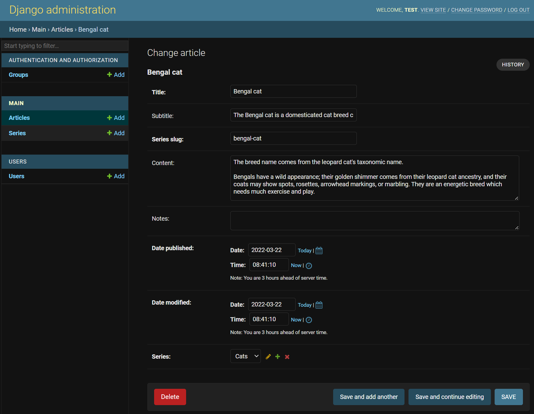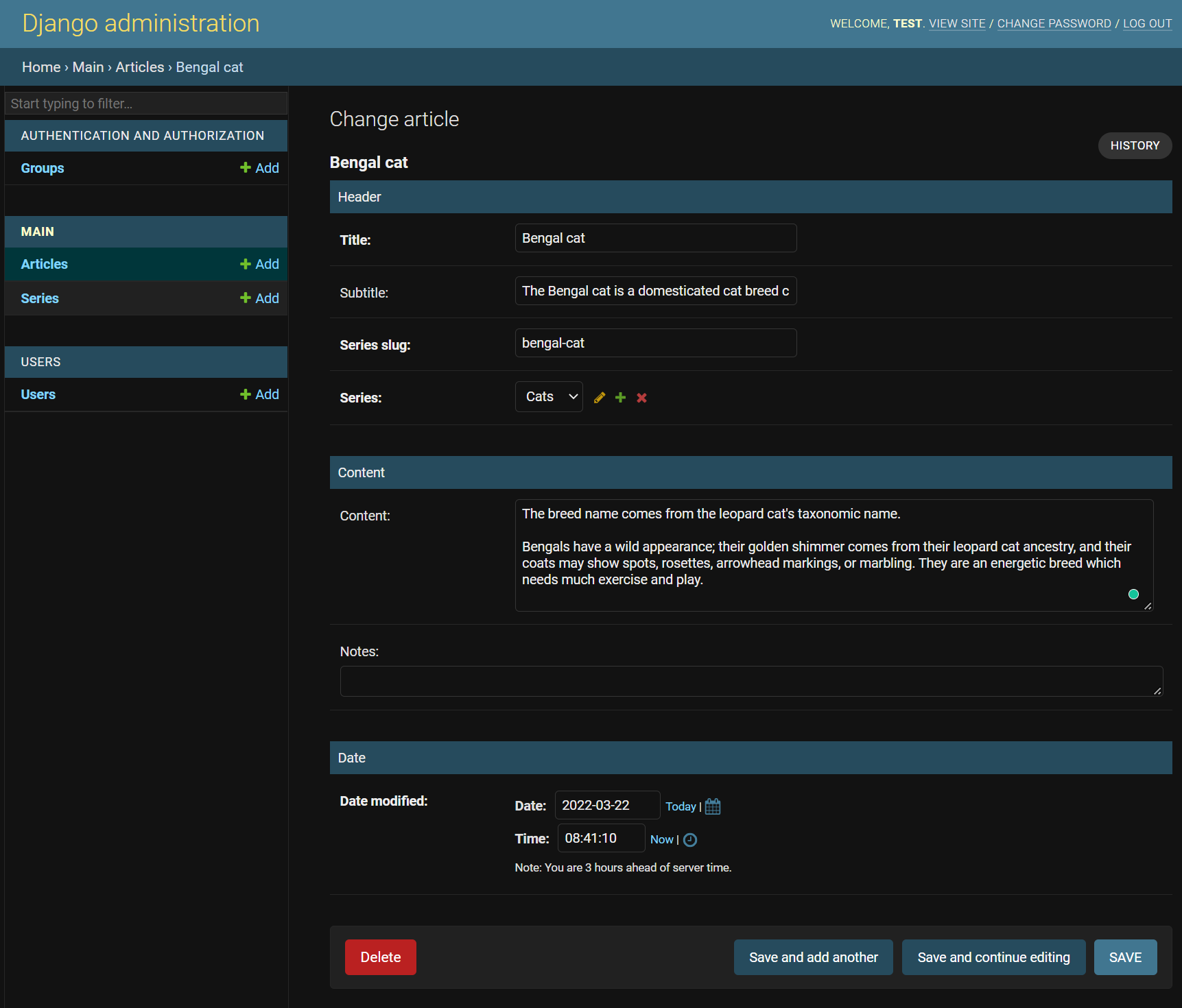 # django_project/main/admin.py ... class ArticleAdmin(admin.ModelAdmin): fieldsets = [ ("Header", {'fields': ["title", "subtitle", "article_slug", "series"]}), ("Content", {"fields": ["content", "notes"]}), ("Date", {"fields": ["modified"]}) ] ... Now refresh the admin page where we were creating or modifying our Article, and we should see something similar to this: