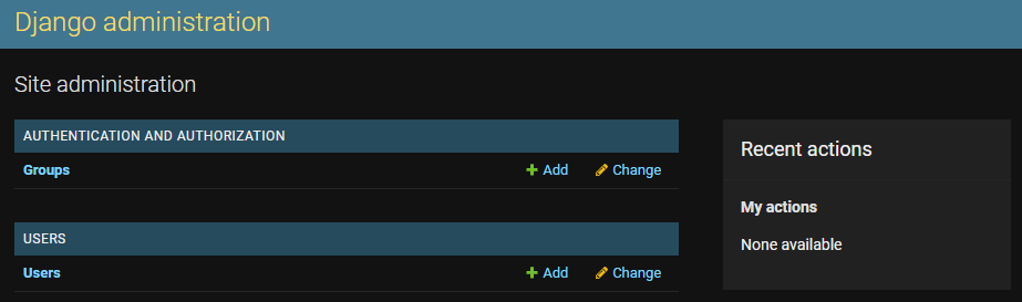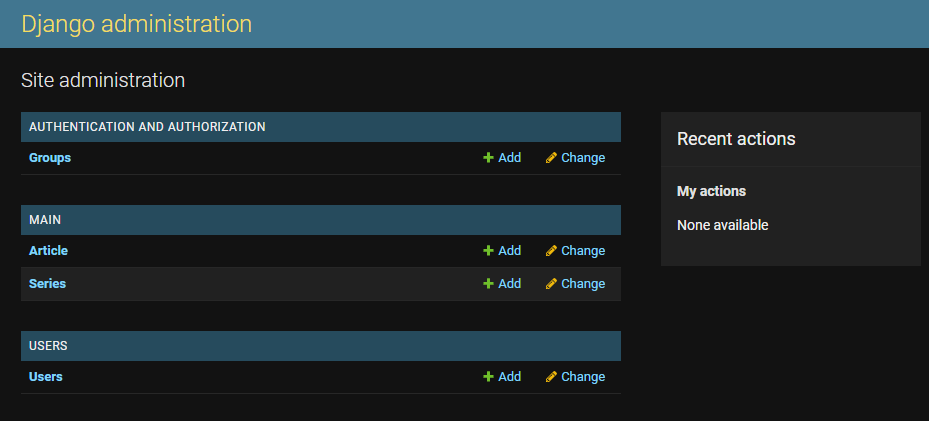 from django.contrib import admin from .models import Article, ArticleSeries # Register your models here. admin.site.register(ArticleSeries) admin.site.register(Article) After registering these models, navigate back to the admin panel, and you should see Groups, Articles, Series, and Users models available:
