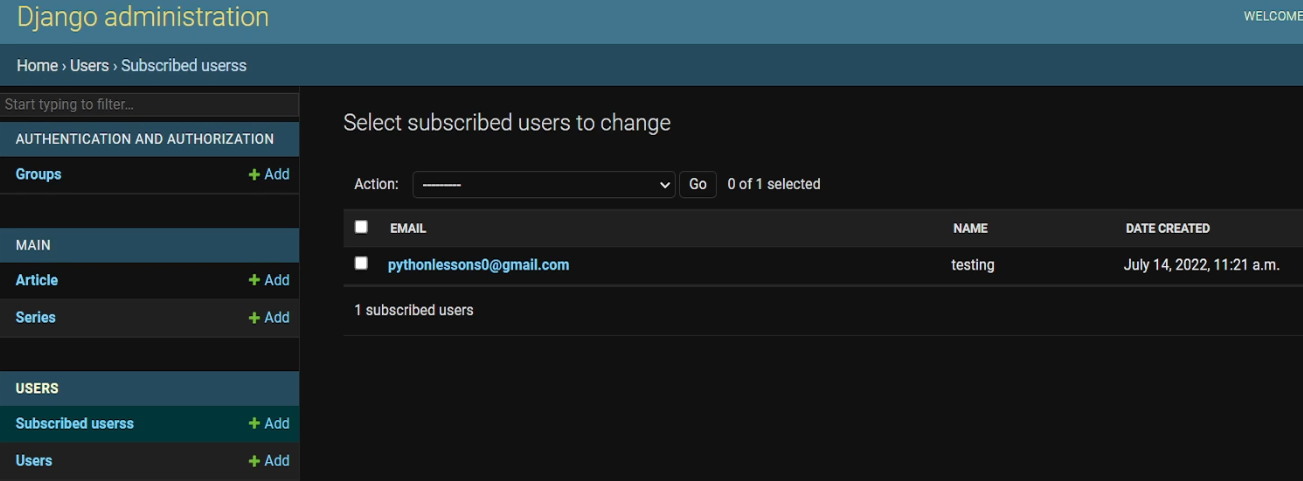 Now, let's log in to our admin user account and navigate to the admin panel page. We are missing a table where we can see all the subscribed users. Let's add this table by registering the "SubscribedUsers" model to the admin site: