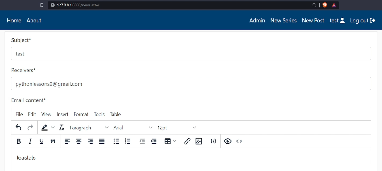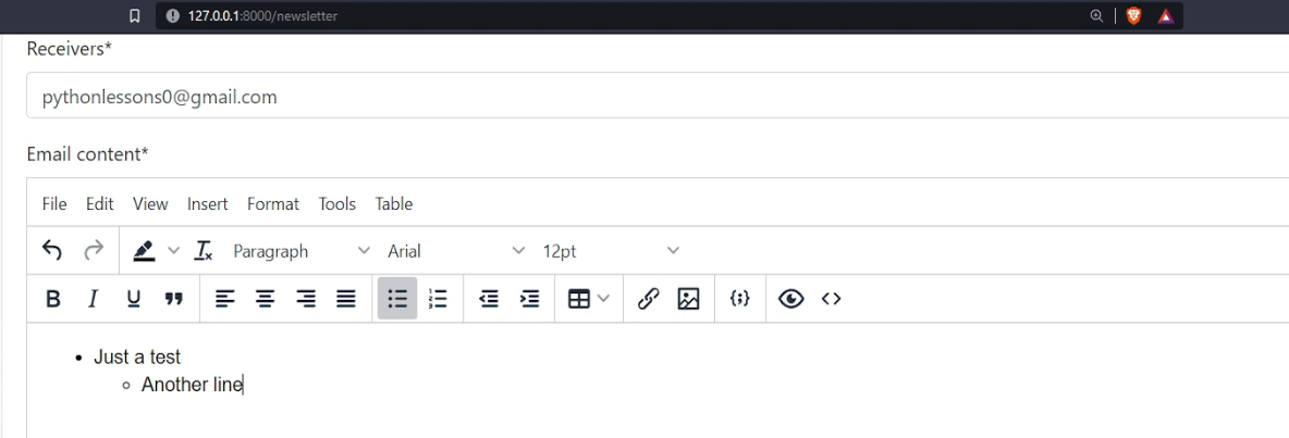 # django_project/main/forms.py from tinymce.widgets import TinyMCE ... class NewsletterForm(forms.Form): subject = forms.CharField() receivers = forms.CharField() message = forms.CharField(widget=TinyMCE(), label="Email content") Here, the subject will be our email title, the receivers will be collected automatically from our subscriber's database, and the message is our HTML message that we'll send to users.
