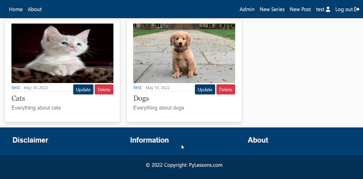 <-- django_project/main/templates/main/header.html --> ... {% include 'main/footer.html' %} ... Now, if I go back to our website and refresh it, we can see the footer: