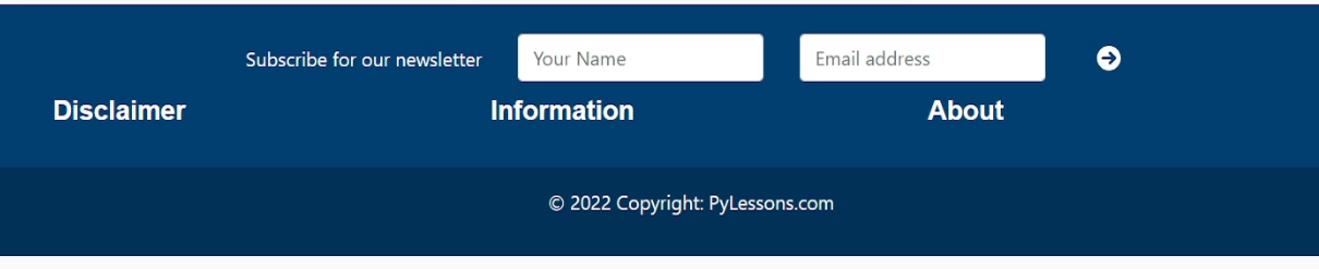 <-- django_project/main/templates/main/footer.html --> <footer class="footer-color text-center footer-text"> <div class="container p-4"> {% if not user.is_authenticated %} <section class=""> <form action="{% url 'subscribe' %}" method="post"> <div class="row d-flex justify-content-center"> {% csrf_token %} <div class="col-auto"> <p class="pt-2">Subscribe for our newsletter</p> </div> <div class="col-auto"> <input id="name" name="name" class="form-control" placeholder="Your Name"/> </div> <div class="col-auto"> <input id="email" name="email" type="email" class="form-control" placeholder="Email address"/> </div> <div class="col-auto"> <button type="submit" class="btn btncolor"> <i class="fa fa-arrow-circle-right fa-lg"></i> </button> </div> </div> </form> </section> {% endif %} <div class="row mobiledevice"> <div class="col-lg-4 col-md-4 col-sm-4 text-left"> <a href="/"> <h4>Disclaimer</h4> </a> </div> <div class="col-lg-4 col-md-4 col-sm-4 text-left"> <h4>Information</h4> </div> <div class="col-lg-4 col-md-4 col-sm-4 text-left"> <a href="/"> <h4>About</h4> </a> </div> </div> </div> <div class="text-center p-3" style="background-color: rgba(0, 0, 0, 0.2);"> <p>© {% now "Y" %} Copyright: <a href="https://PyLessons.com/">PyLessons.com</a> </p> </div> </footer> As you can see, our template is pretty simple; there is a username and email input fields, submit button, and some additional information at the end. And also, there is a copyright text that automatically updates the year as time passes.