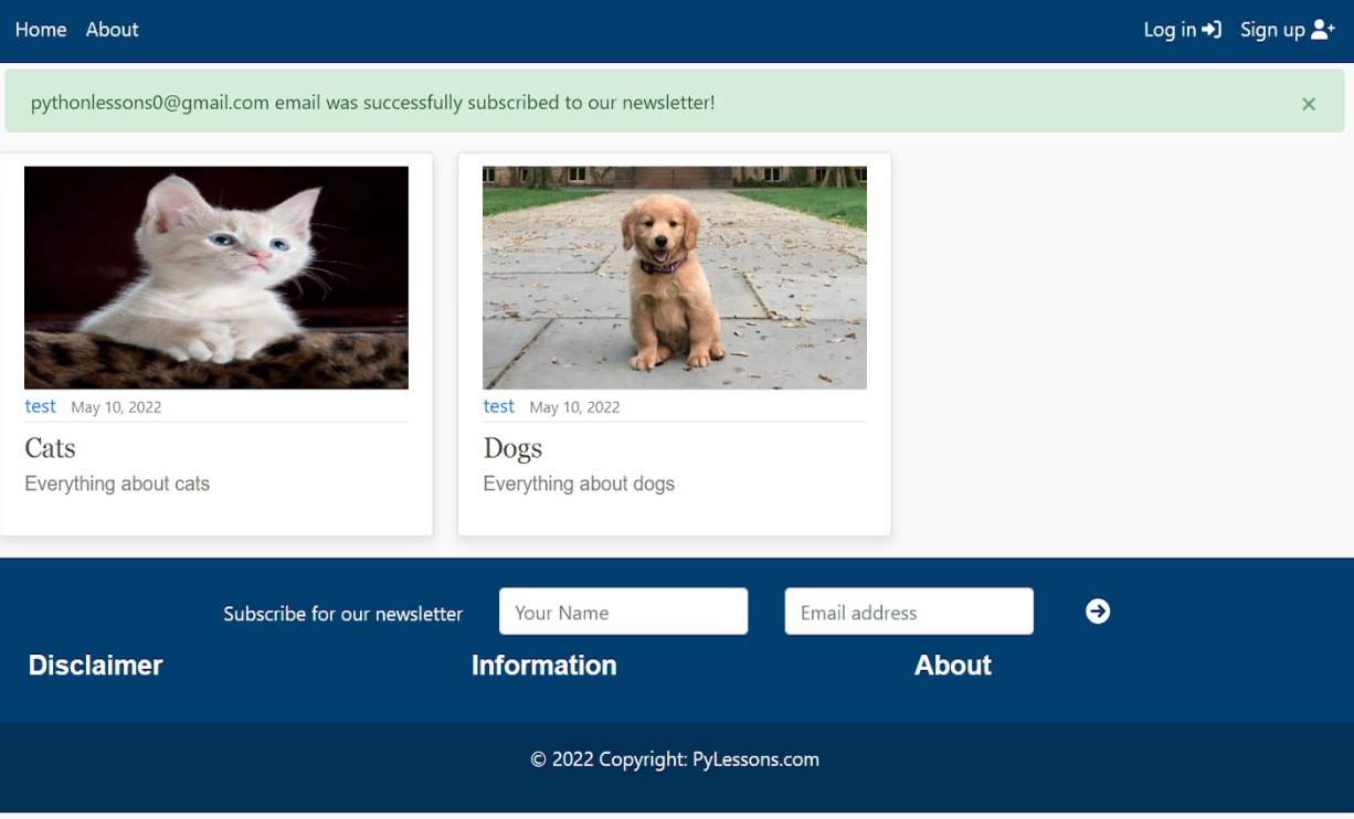So, as we can see, it was pretty easy to implement subscription functionality into our Django project. Now it is up to our users if they want to subscribe to the newsletter or register their user account.