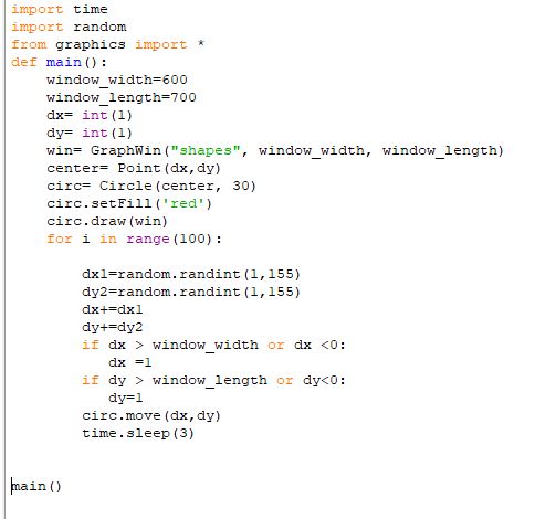 import time import random from graphics import * def main(): window_width=600 window_length=700 dx= int(1) dy= int(1) win= GraphWin("shapes", window_width, window_length) center= Point(dx,dy) circ= Circle(center, 30) circ.setFill('red') circ.draw(win) for i in range(100): dx1=random.randint(1,155) dy2=random.randint(1,155) dx+=dx1 dy+=dy2 if dx > window_width or dx <0: dx =1 if dy > window_length or dy<0: dy=1 circ.move(dx,dy) time.sleep(3) buran write Nov-15-2025, 07:23 AM: