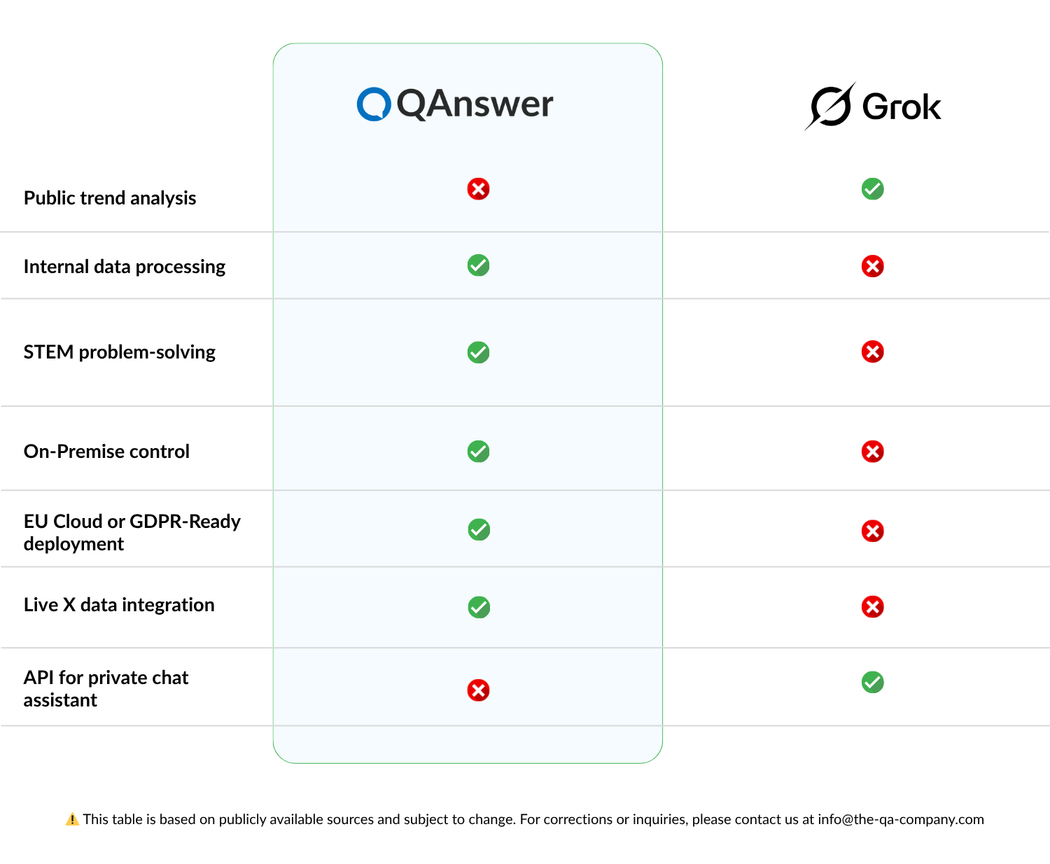 Alors que Grok 3 fournit un raisonnement général de pointe pour les requêtes publiques, QAnswer permet aux organisations de créer des assistants internes qui reproduisent ces informations en plus de leurs propres connaissances privées et conformes.