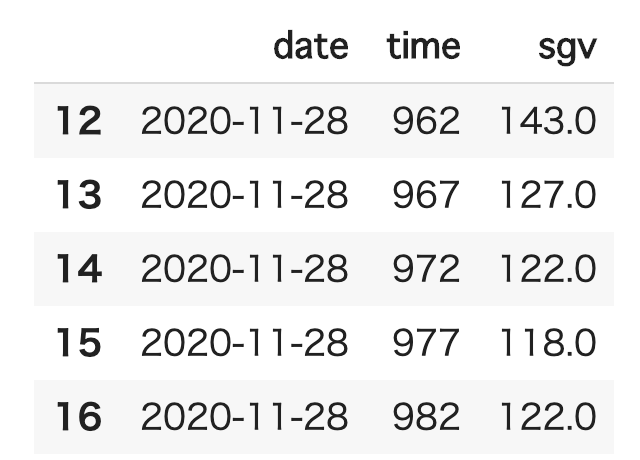 - 2020/11/28-2020/12/5まで(時々抜けはあるけれども)の5分おきの血糖値データ