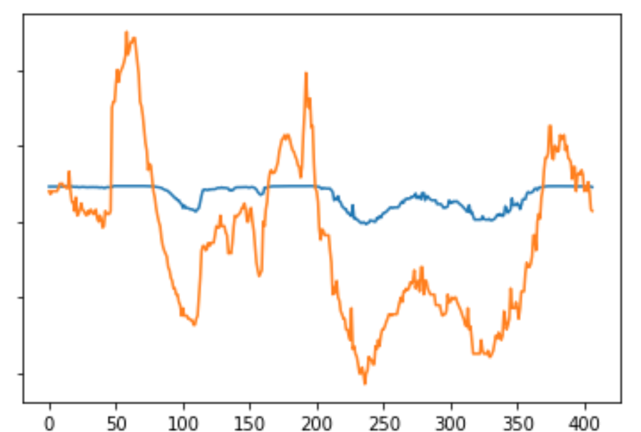 イマイチっぽい感じ、、、 予測結果(青:予測、オレンジ:実際)