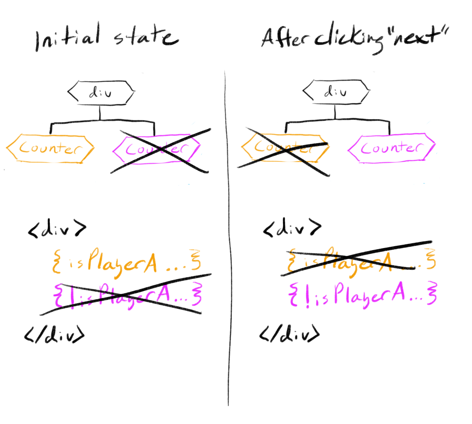 {isPlayerA ? ( <Counter key="Taylor" person="Taylor" /> ) : ( <Counter key="Sarah" person="Sarah" /> )}Specifying a key tells React to use the key itself as part of the position, instead of their order within the parent. This is why, even though you render them in the same place in JSX, from React’s perspective, these are two different counters. As a result, they will never share state. Every time a counter appears on the screen, its state is created. Every time it is removed, its state is destroyed. Toggling between them resets their state over and over.