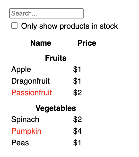 import { useState } from 'react'; function FilterableProductTable({ products }) { const [filterText, setFilterText] = useState(''); const [inStockOnly, setInStockOnly] = useState(false); return ( <div> <SearchBar filterText={filterText} inStockOnly={inStockOnly} /> <ProductTable products={products} filterText={filterText} inStockOnly={inStockOnly} /> </div> ); } function ProductCategoryRow({ category }) { return ( <tr> <th colSpan="2"> {category} </th> </tr> ); } function ProductRow({ product }) { const name = product.stocked ? product.name : <span style={{ color: 'red' }}> {product.name} </span>; return ( <tr> <td>{name}</td> <td>{product.price}</td> </tr> ); } function ProductTable({ products, filterText, inStockOnly }) { const rows = []; let lastCategory = null; products.forEach((product) => { if ( product.name.toLowerCase().indexOf( filterText.toLowerCase() ) === -1 ) { return; } if (inStockOnly && !product.stocked) { return; } if (product.category !== lastCategory) { rows.push( <ProductCategoryRow category={product.category} key={product.category} /> ); } rows.push( <ProductRow product={product} key={product.name} /> ); lastCategory = product.category; }); return ( <table> <thead> <tr> <th>Name</th> <th>Price</th> </tr> </thead> <tbody>{rows}</tbody> </table> ); } function SearchBar({ filterText, inStockOnly }) { return ( <form> <input type="text" value={filterText} placeholder="Search..."/> <label> <input type="checkbox" checked={inStockOnly} /> {' '} Only show products in stock </label> </form> ); } const PRODUCTS = [ {category: "Fruits", price: "$1", stocked: true, name: "Apple"}, {category: "Fruits", price: "$1", stocked: true, name: "Dragonfruit"}, {category: "Fruits", price: "$2", stocked: false, name: "Passionfruit"}, {category: "Vegetables", price: "$2", stocked: true, name: "Spinach"}, {category: "Vegetables", price: "$4", stocked: false, name: "Pumpkin"}, {category: "Vegetables", price: "$1", stocked: true, name: "Peas"} ]; export default function App() { return <FilterableProductTable products={PRODUCTS} />; } In the sandbox above, ProductTable and SearchBar read the filterText and inStockOnly props to render the table, the input, and the checkbox. For example, here is how SearchBar populates the input value: