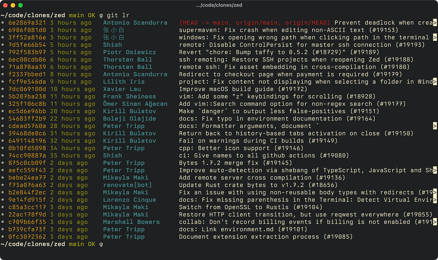 (Is there a reason why git lr is not aliases to glr? No, except that I’m lazy and would probably never pick up the alias after years of git lr.)