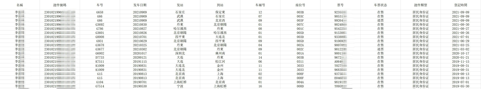 • 航空订票记录:有过订票记录,但是不一定实际出发。实际的航班以离岗记录里的为准。