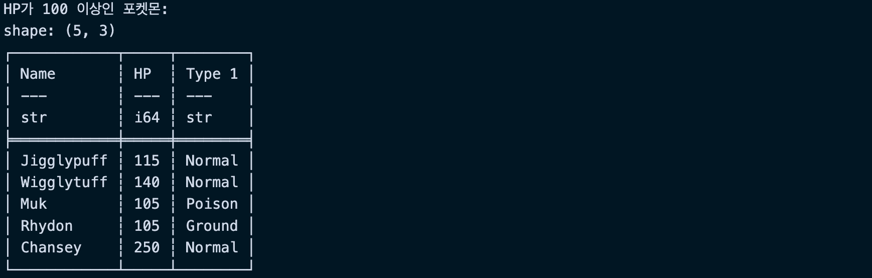 # HP가 100 이상인 포켓몬 찾기 high_hp = df.filter(pl.col("HP") >= 100) print("HP가 100 이상인 포켓몬:") print(high_hp.select(["Name", "HP", "Type 1"]).head()) 실행결과