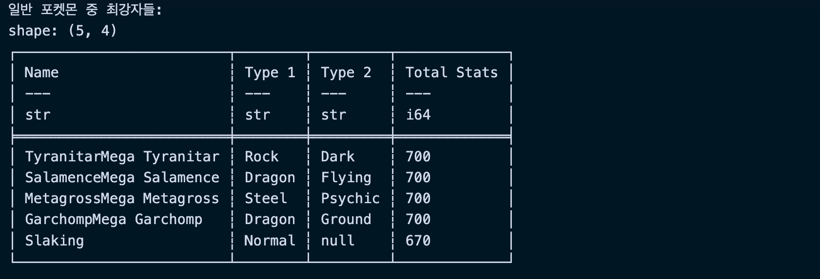 strongest = ( df # 전설의 포켓몬 제외 .filter(~pl.col("Legendary")) # 총 스탯 계산 .with_columns( ( pl.col("HP") + pl.col("Attack") + pl.col("Defense") + pl.col("Sp. Atk") + pl.col("Sp. Def") + pl.col("Speed") ).alias("Total Stats") ) # 총 스탯 기준 정렬 .sort("Total Stats", descending=True) # 필요한 컬럼만 선택 .select(["Name", "Type 1", "Type 2", "Total Stats"]) ) print("일반 포켓몬 중 최강자들:") print(strongest.head()) 실행결과