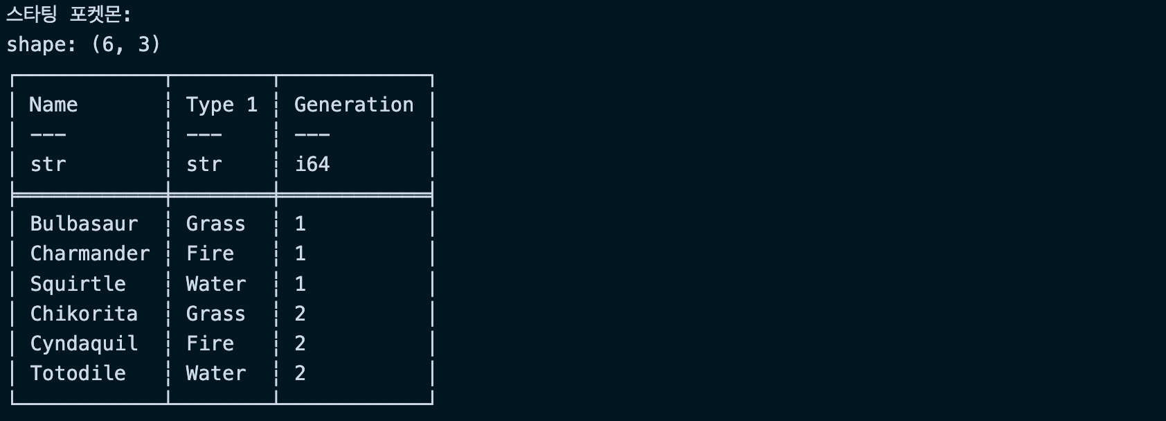 # 스타팅 포켓몬들 찾기 starters = ["Bulbasaur", "Charmander", "Squirtle", "Chikorita", "Cyndaquil", "Totodile"] starter_pokemon = df.filter(pl.col("Name").is_in(starters)) print("스타팅 포켓몬:") print(starter_pokemon.select(["Name", "Type 1", "Generation"])) 실행결과