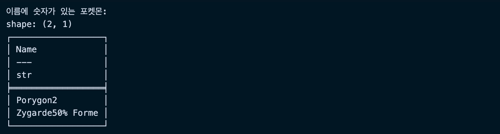 # 이름에 숫자가 포함된 포켓몬 numbered = df.filter(pl.col("Name").str.contains(r"\d")) print("\n이름에 숫자가 있는 포켓몬:") print(numbered.select(["Name"]).head())