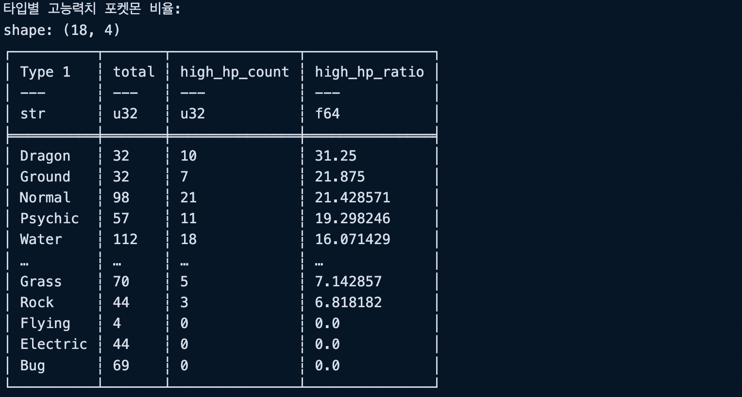 # 타입별로 HP가 100 이상인 포켓몬의 수와 비율 계산 type_hp_stats = df.group_by("Type 1").agg([ pl.col("HP").count().alias("total"), (pl.col("HP") >= 100).sum().alias("high_hp_count"), ((pl.col("HP") >= 100).sum() / pl.col("HP").count() * 100).alias("high_hp_ratio") ]) print("타입별 고능력치 포켓몬 비율:") print(type_hp_stats.sort("high_hp_ratio", descending=True))