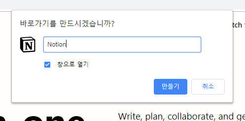 아래 사진과 같은 모달이 뜨는데 원하는 이름으로 변경하고, 창으로 열기를 선택합니다. 만들기를 눌러줍니다.
