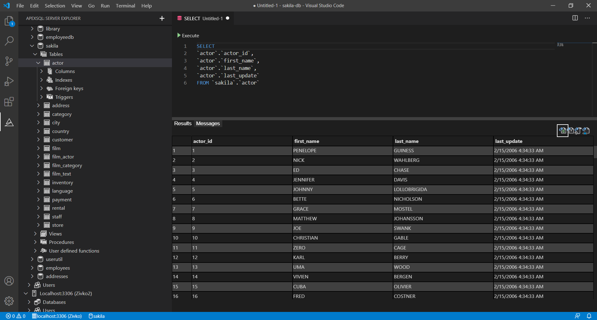 Using the Export to Excel feature from ApexSQL Database Power Tools for VS Code, query results can be exported to MySQL data from the results grid in just a few steps. Besides exporting data to Excel, this VS Code extension provides a couple of more exporting options, such as export data to JSON, CSV, and HTML file format.