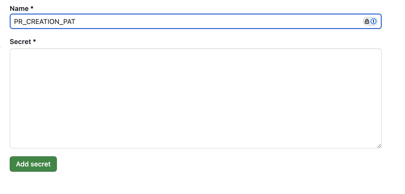 In all SDK repositories, navigate to Settings > Secrets and variables > Actions and save the PAT as a Repository secret under the name PR_CREATION_PAT.
