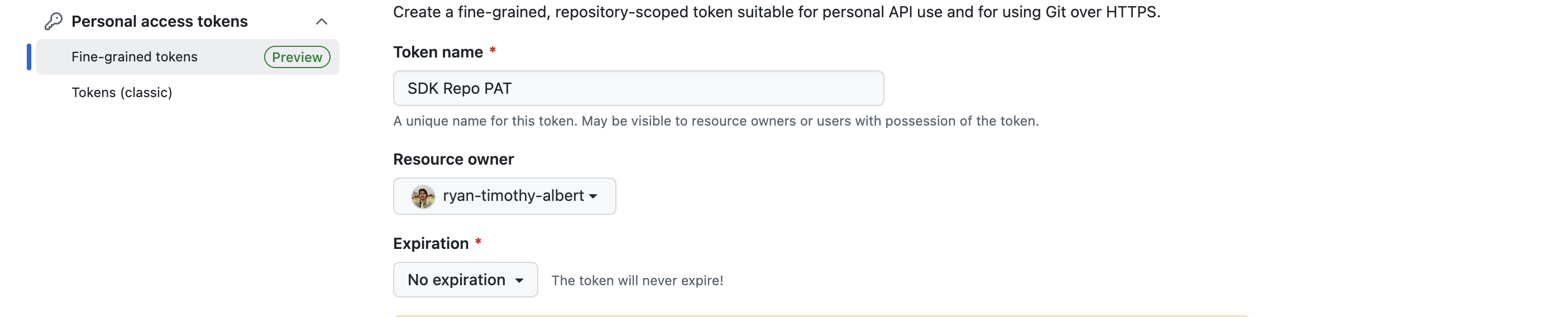 Create a fine-grained PAT with Pull requests Read/Write permissions. Ensure it has access to the SDK repository. Setting this to no expiration is recommended.