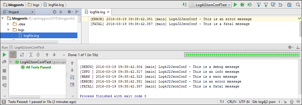 package guru.springframework.blog.log4j2yaml; import org.junit.Test; import static org.junit.Assert.*; public class Log4J2YamlConfTest { @Test public void testPerformSomeTask() throws Exception { Log4J2YamlConf log4J2YamlConf = new Log4J2YamlConf(); log4J2YamlConf.performSomeTask(); } }Configuring Console and File Appenders