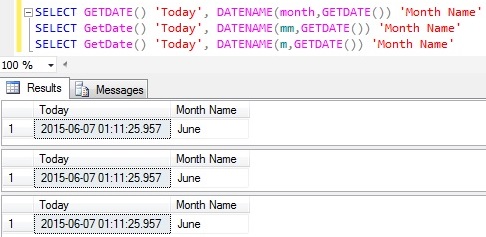 SELECT GETDATE() 'Today', DATENAME(month,GETDATE()) 'Month Name' SELECT GetDate() 'Today', DATENAME(mm,GETDATE()) 'Month Name' SELECT GetDate() 'Today', DATENAME(m,GETDATE()) 'Month Name'