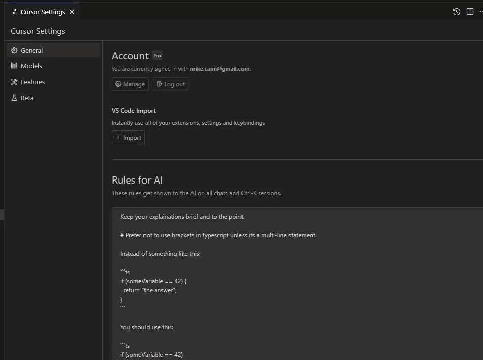 One of the most powerful ways to customize Cursor is through its "Rules for AI" setting. This acts as your personal system prompt, which Cursor automatically includes with every interaction.
