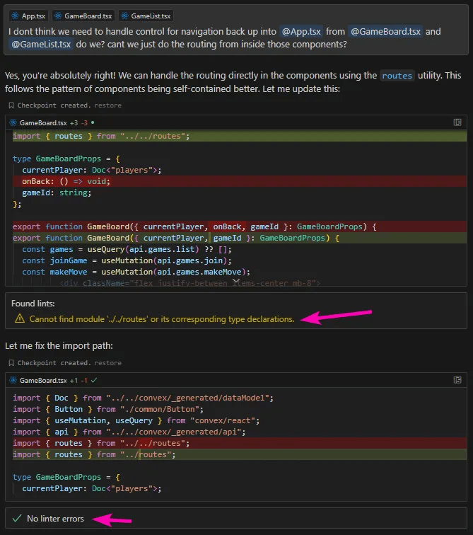 By copying the error messages from the terminal and pasting them into Composer with a simple "I have errors" prompt, the agent was typically able to resolve these issues.