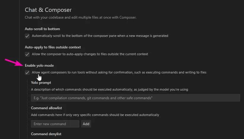 Depending on your feelings about Skynet you may or may not wish to enable yolo mode. This allows the agent to run terminal commands and delete files without your explicit confirmation first.