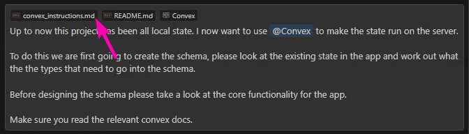 While referencing the @Convex docs is helpful, I found the agent still made occasional basic Convex-related mistakes. To prevent these frustrating errors, I created a document containing common issues and key excerpts from the Convex docs. This approach proved effective at reducing simple mistakes.