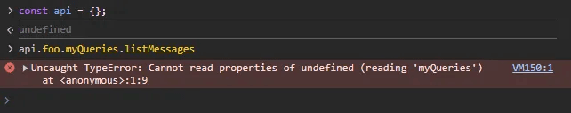 1const api = {}; 2console.log(api.foo.myQueries.listMessages) 3You will be greeted by a lovely cannot read properties of undefined error: