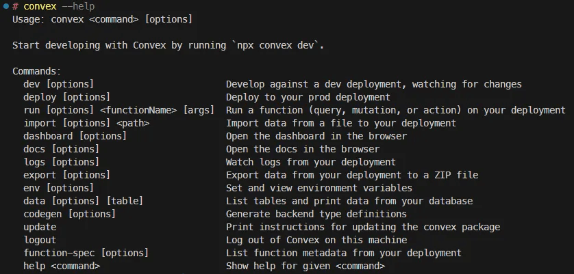1... 2const program = new Command(); 3 program 4 .name("convex") 5 .usage("<command> [options]") 6 .description("Start developing with Convex by running `npx convex dev`.") 7 .addCommand(login, { hidden: true }) 8 .addCommand(init, { hidden: true }) 9 .addCommand(reinit, { hidden: true }) 10 .addCommand(dev) // <-- this is the one we are looking for 11 .addCommand(deploy) 12 .addCommand(deployments, { hidden: true }) 13 .addCommand(run) 14 .addCommand(convexImport) 15 .addCommand(dashboard) 16 .... 17As expected this file lists the main “program” and is using the excellent Commander library to help with the CLI.