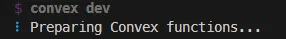 1 ... 2 while (true) { 3 const start = performance.now(); 4 tableNameTriggeringRetry = null; 5 shouldRetryOnDeploymentEnvVarChange = false; 6 const ctx = new WatchContext(cmdOptions.traceEvents); 7 showSpinner(ctx, "Preparing Convex functions..."); 8 try { 9 await runPush(ctx, options); 10 const end = performance.now(); 11 ... 12That "Preparing Convex functions..." is a good sign that we are on the right track as this is what you see when you make a change to a Convex file right before the codegen does its thing.
