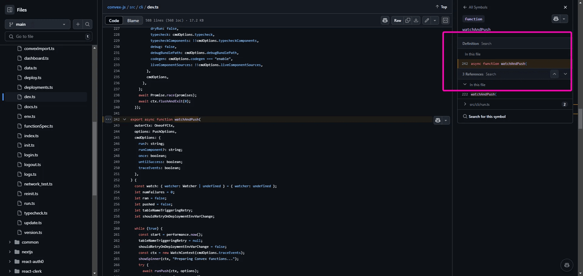 1 promises.push( 2 watchAndPush( 3 ctx, 4 { 5 ...credentials, 6 verbose: !!cmdOptions.verbose, 7 dryRun: false, 8 typecheck: cmdOptions.typecheck, 9 typecheckComponents: !!cmdOptions.typecheckComponents, 10 debug: false, 11 debugBundlePath: cmdOptions.debugBundlePath, 12 codegen: cmdOptions.codegen === "enable", 13 liveComponentSources: !!cmdOptions.liveComponentSources, 14 }, 15 cmdOptions, 16 ), 17 ); 18As a side note, Github's reference sidebar has been invaluable in helping me navigate the codebase and track function references: