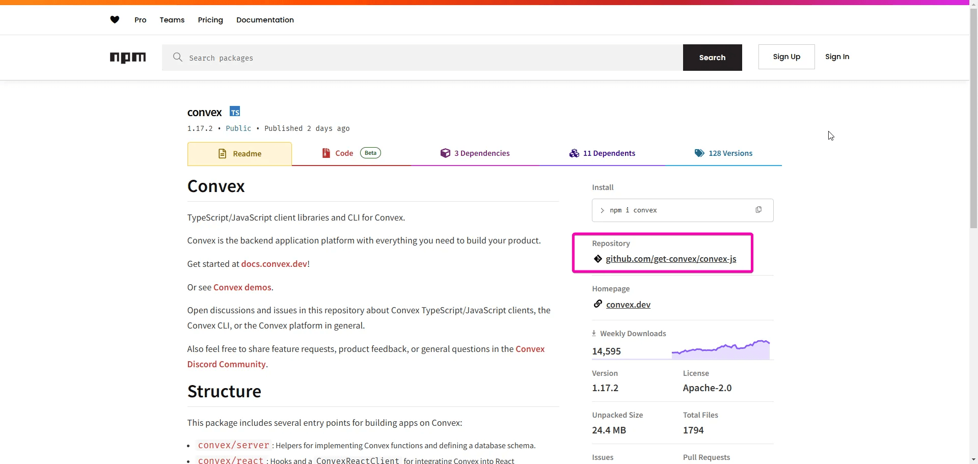 So I guess a sensible place to start would be to checkout the convex dev command. Lets start by looking at the npm package for the convex CLI command and seeing where it points to.