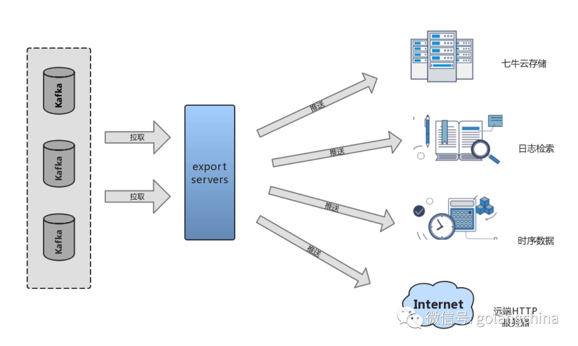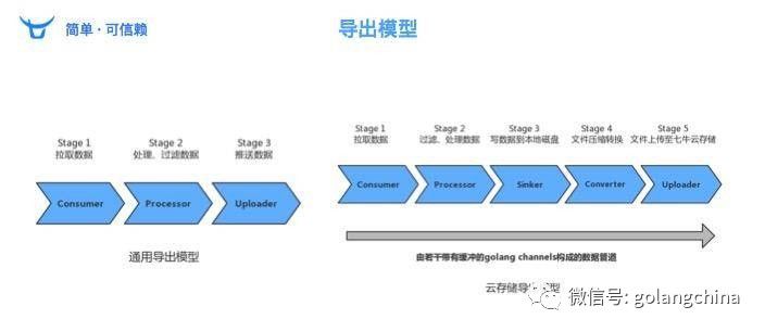 我们对整个系统的要求,除了了高吞吐低延时之外,还必须能将数据传送到多种下游,比如说七牛云存储、数据库服务、实时数据库、日志检索当中去。这要求要考虑多种导出业务逻辑上的相同和不同的点。我们整理出两种模型,第一种是通用导出模型,一个任务开始执行之后,要从上游拉取数据,经过一些处理和过滤之后,将数据推送到下游系统,比如说图中的日志检索、时序数据和远端的http服务等。除此之外有一个特例,就是七牛云存储,系统数据导出到云存储之后不要有太多的小文件,也不要占用太多的空间,否则从存储费用和下游系统二次处理这些数据的角度看都有不少弊端。所以,我们增加了中间的两步,就是把数据存储在本地,进行一次压缩之后再存到云存储,这样的话可以有效的减少文件的个数,也能减小云存储空间的使用,降低了用户的成本。