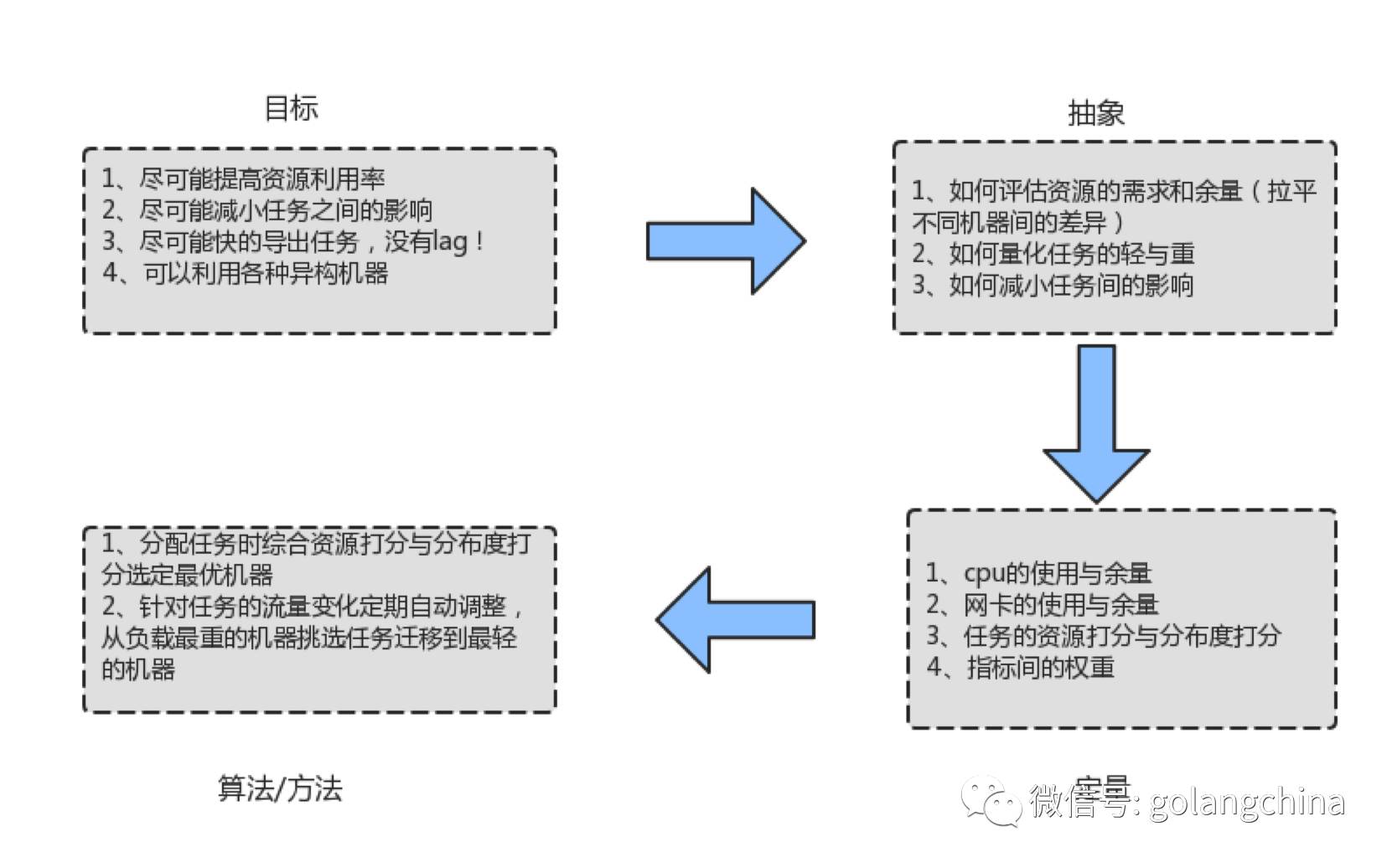 在了解了调度的框架之后,接下来我们看一下是系统是如何调度任务的。我们的目标是提高资源的利用率,减少任务之间的影响,包括说尽量把降低任务的延迟。最后一点比较特殊,我们要尝试用各种异构的机器。最开始设置的时候,发现我们的服务器有好几种不同的规格,比如说CPU、网络,甚至硬盘的规格以及数量差异都很大。我们怎么才能合理的去调度,利用这些机器呢?我们对整个调度做了一些抽象,就是怎么去评估资源的需求和余量。比如说一台四核16G的机器和一台两核的机器差别是什么,应该怎么用它呢?就涉及到第一个问题,就是它的需求和余量评估,还有任务的轻和重。并不是每个任务都一样,总是有一些任务数据来得又快又猛,有一些相对比较空闲,量化它也是一个调量。
