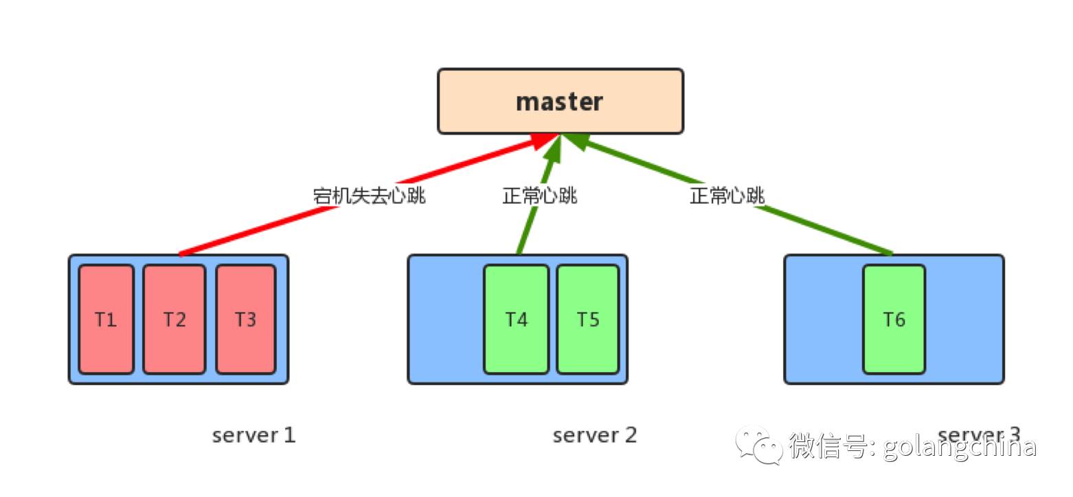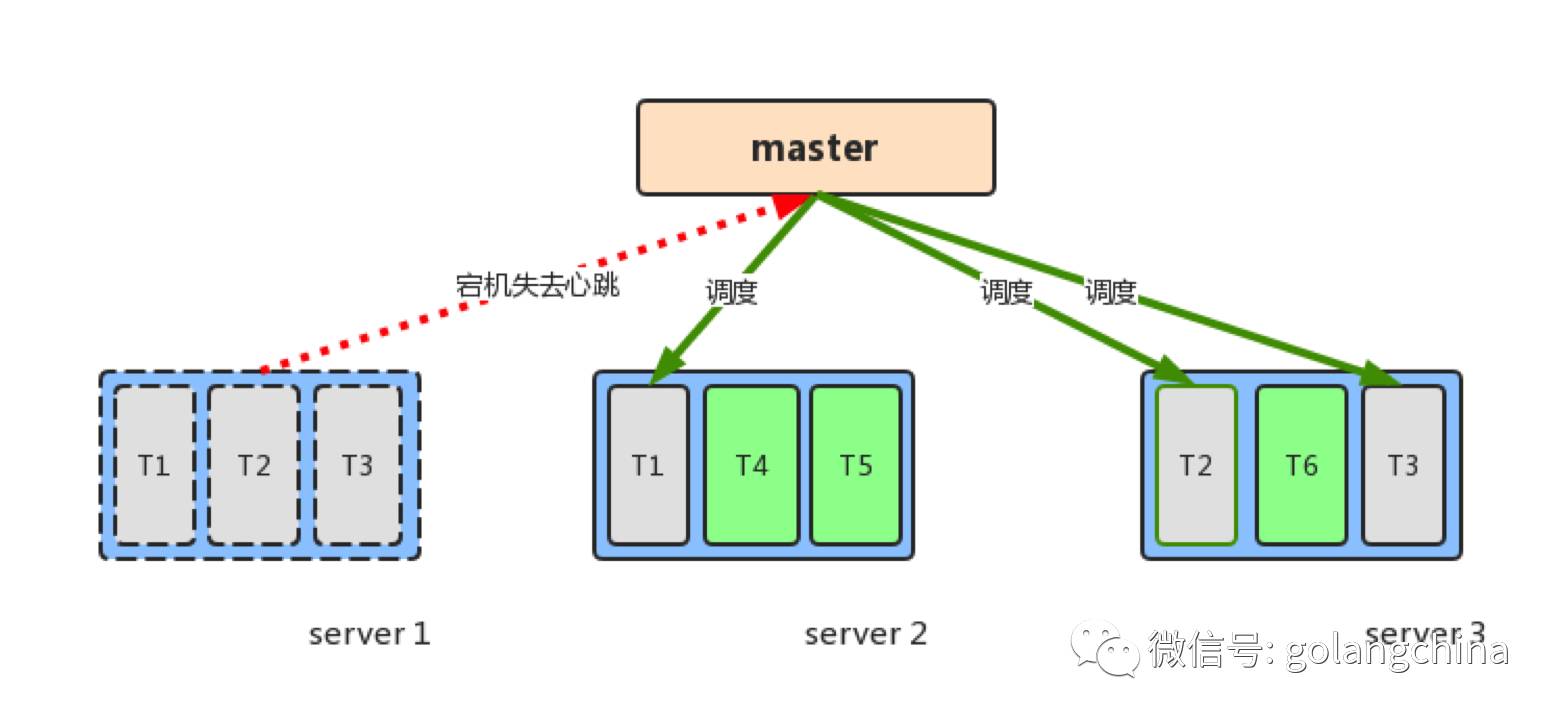 那么server是如何实现高可用的呢?server要通过上报心跳的方式表明自己的存在,以及自己正在执行哪些任务。比如说server1正在执行三个任务,现在网络断联,master在两个心跳周期内一直都没有发现server1的存在,那么server1上面的T1、T2、T3就被master调度到其他的机器上,server1就从集群中摘掉了。这里的server也是无状态的设计,某一台机器的宕机不会对服务造成影响。