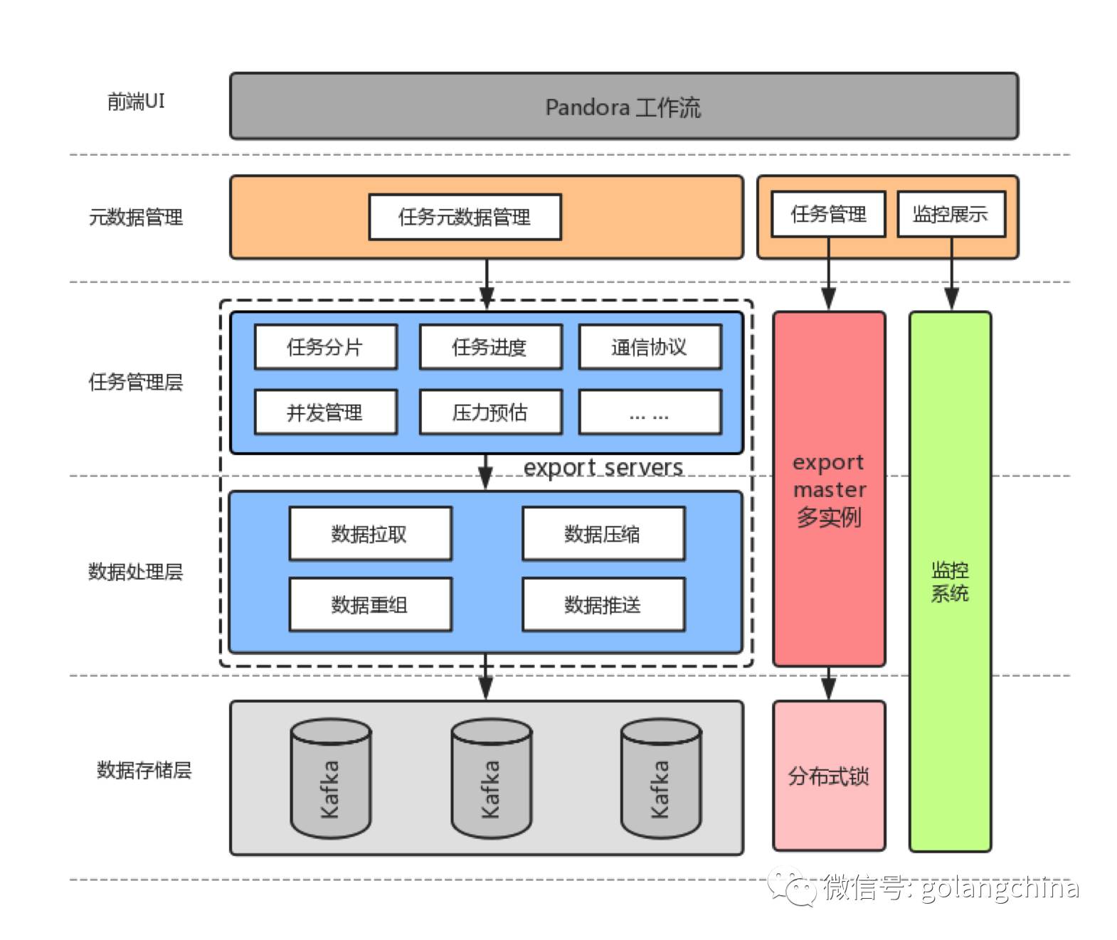 这个系统最核心的是图中的红色和蓝色框部分,这是一个master/server结构的系统,经过master的分配和调度,把数据拉到下游的各个业务模块里。最右边的绿色框图是我们的监控系统,这个监控系统从最上层的业务指标、链路性能,以及机器的健康状况都可以收集和监控。黄色框图部分可以对业务和监控做可视化的展示。在图 1 的可视化的界面中,用户可以通过鼠标式的拖拽创建工作流,这个工作流的导出部分体现在导出系统当中就是做数据的拉取、处理和推送的工作。