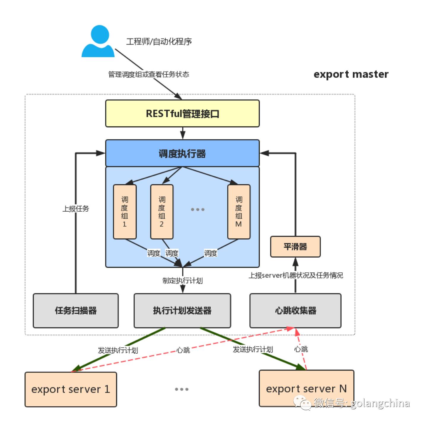 看完了刚才的高可用和水平扩展之后,可以看一下整个Export Service。export master有个任务扫描器、执行计划发送器和心跳收集器。心跳收集器会收到每台机器的心跳,形成server列表,server列表包括了所有资源的使用,包括CPU、跑的任务等。经过一次评话之后,信息被传送到执行器,执行器里有好几个调度组。每一个调度组中有各自的export server,以及各自不同的任务,各个调度组之间是完全隔离的。各个调度组调度的结果会统一传送给发送器,发送器会周期性的把计划下发给每个server。