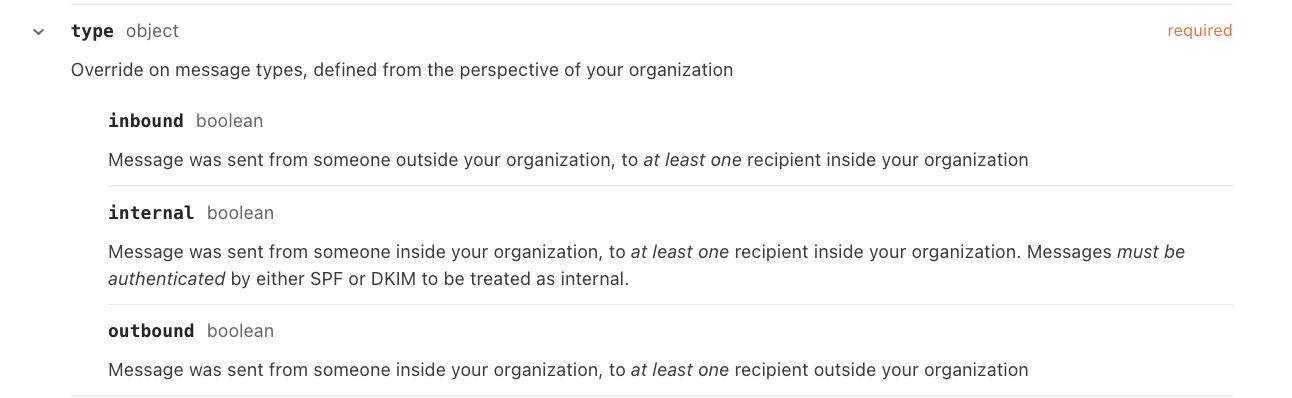 This schema is used by MQL when writing email detections. For example, typing the MQL snippet type.inbound uses the MDM’s type object and .inbound boolean field to describe inbound email messages. More on syntax in the next section.
