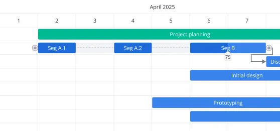 React Gantt PRO allows a single task to be split into multiple segments on the same row. This is useful for representing pauses, interruptions, or phased work on a single row.
