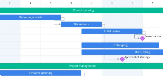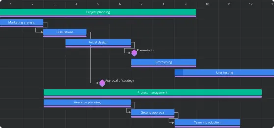 Critical path highlights the sequence of tasks that influence the project deadline, making it easier to spot risks and bottlenecks. The baselines feature allows you to compare planned vs actual timelines directly on the chart.